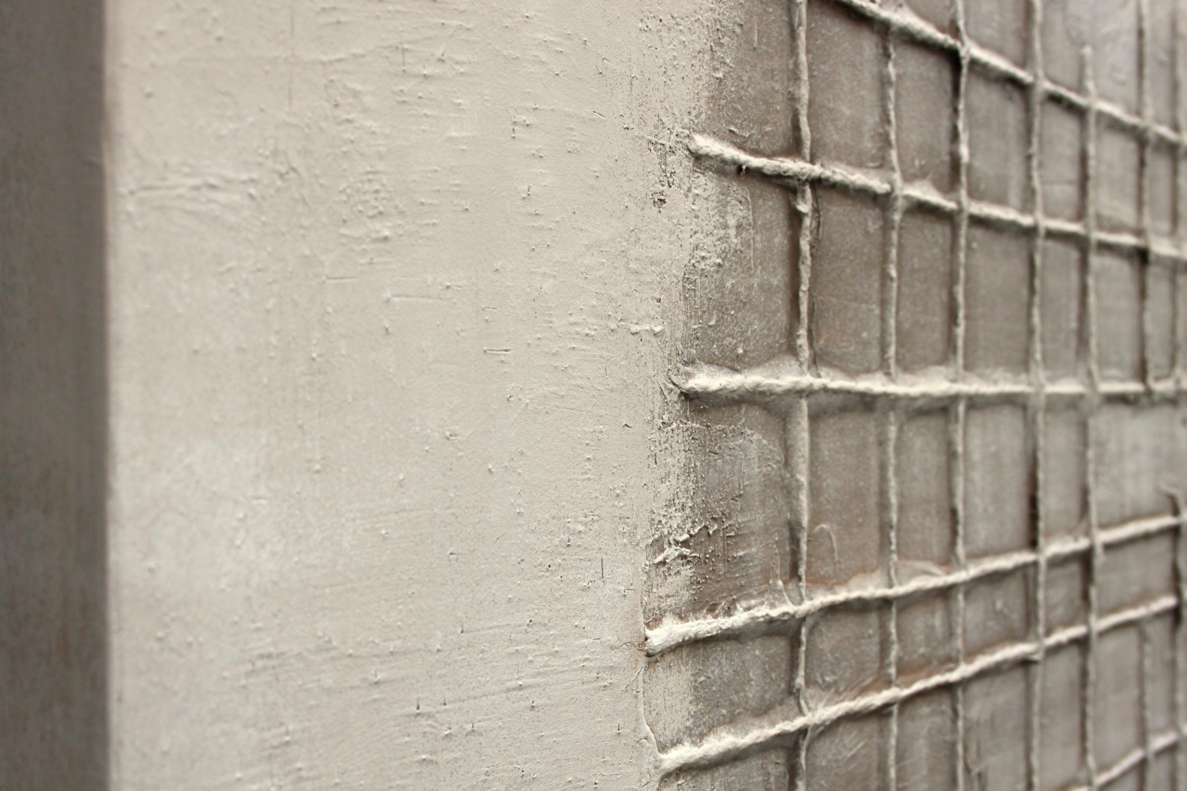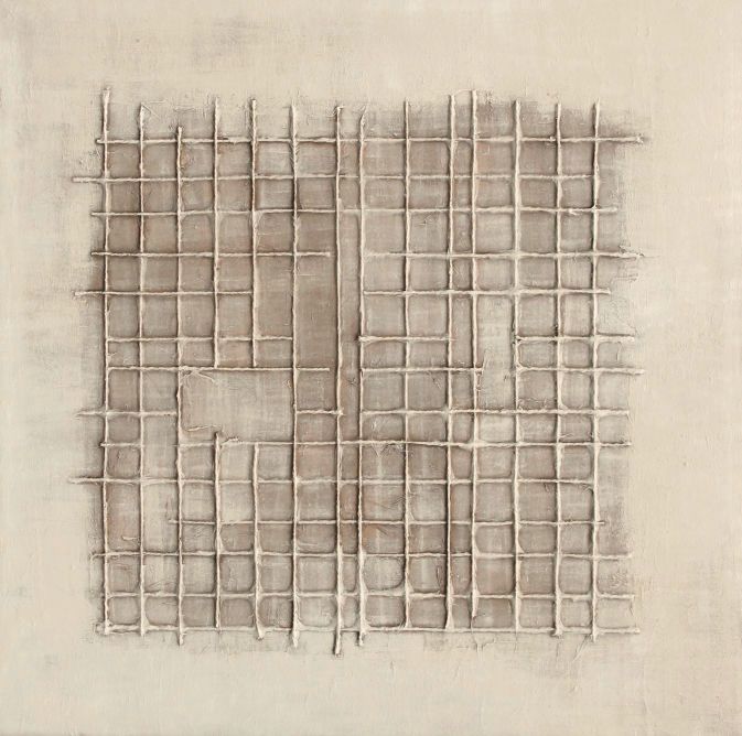 This painting embodies the essence of Wabi-sabi by celebrating the beauty that lies in imperfection and simplicity. Texture is a key element in this work. The grid is constructed from a material that protrudes from the background, creating a significant tactile relief. The surface of this material appears rough, with imperfections and variations, suggesting a handcrafted and organic quality. The colour palette is limited to neutral and earthy tones. Off-whites, beiges and pale greys predominate, with subtle variations that add depth without introducing striking contrasts. Painting ready to hang without a decorative frame included.